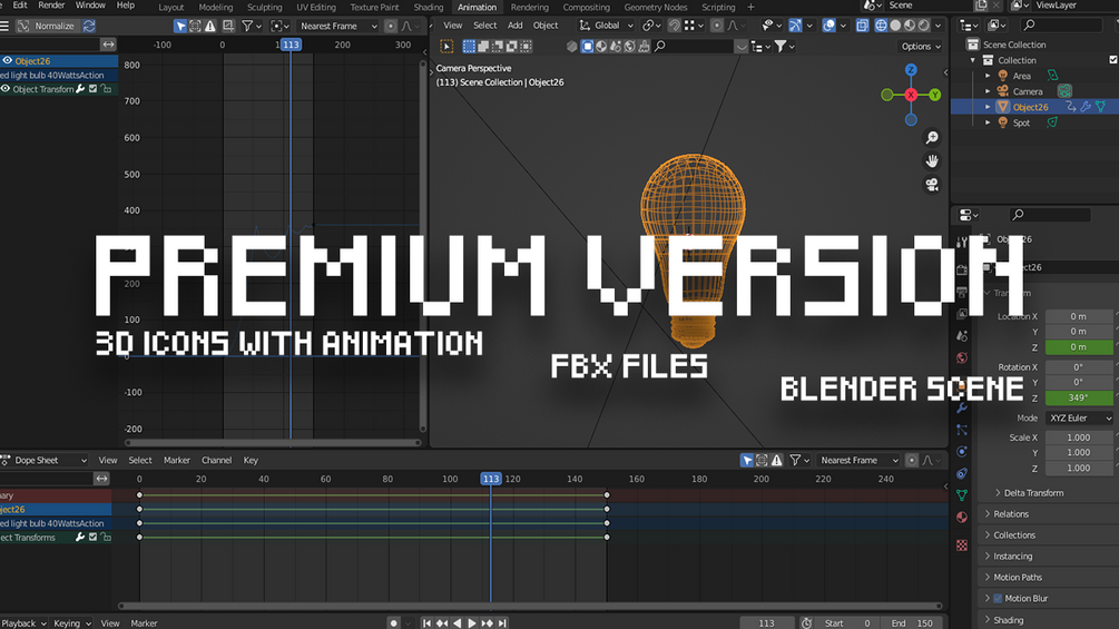 Premium - contains the Basic version + all 27 icons in FBX format. Also you have the blender files and scene with animation.